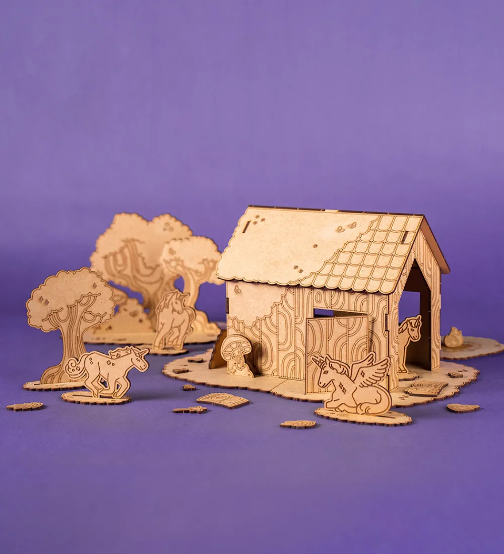 Hyggeligt Crateit kreatsæt i form af en stald og fine figurer af HDF-træplader i et magisk skov-tema.