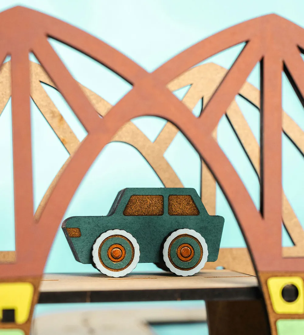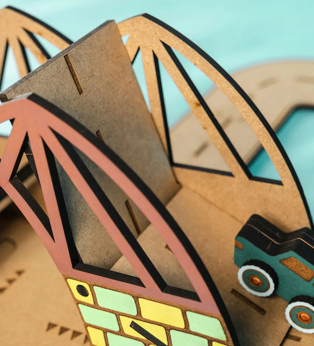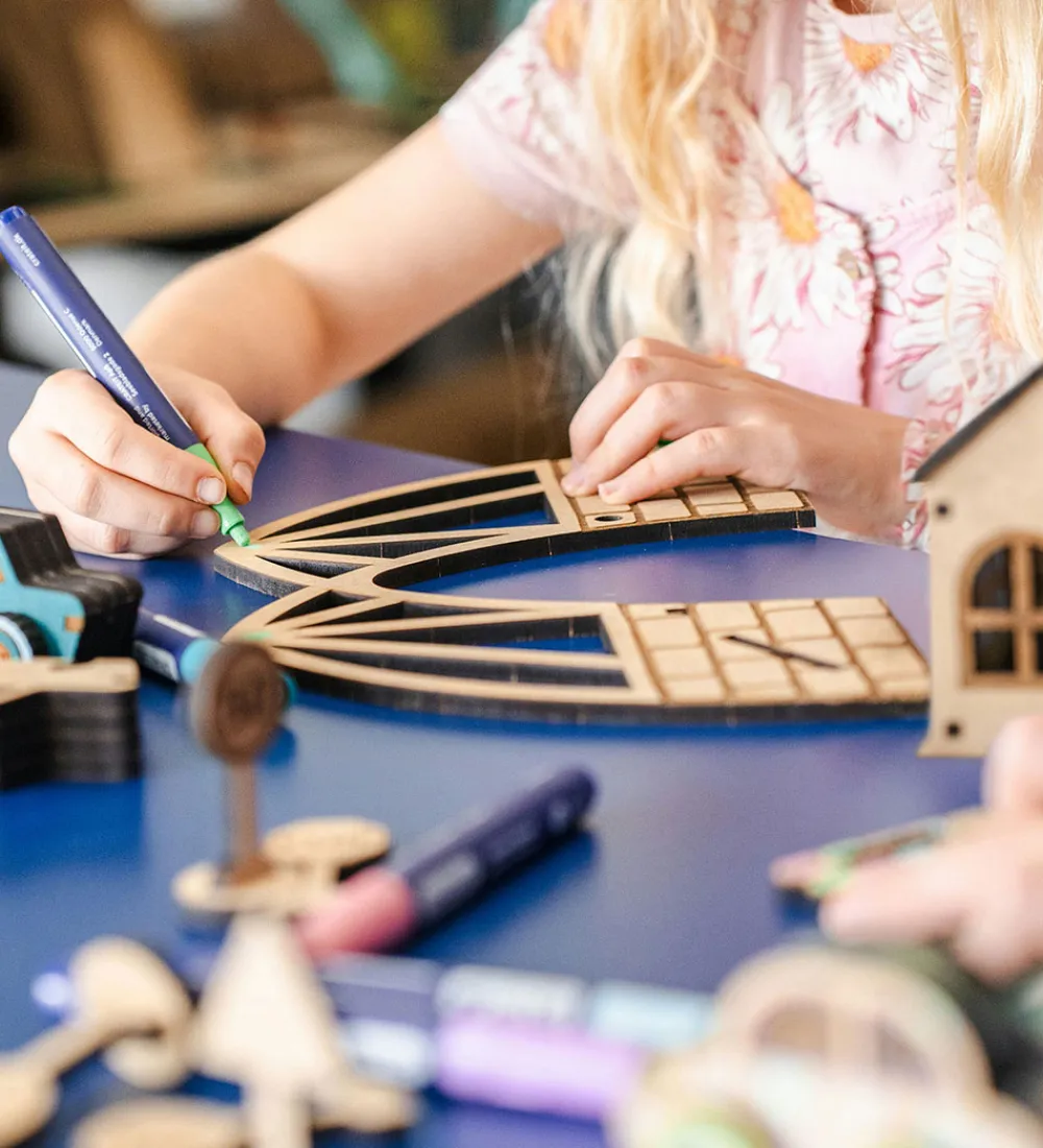 Med Crateit sættet kan du bygge din egen vej og hængebro, samt er træet ufarvet og du skal derfor selv farvelægge det. Det kan farves med alle typer af tusser, maling eller farveblyanter.