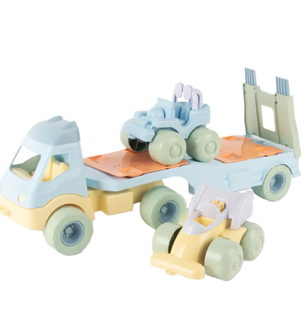 Farverigt Dantoy legetøj bestående af en lastbil med to biler i bløde pastelfarver.