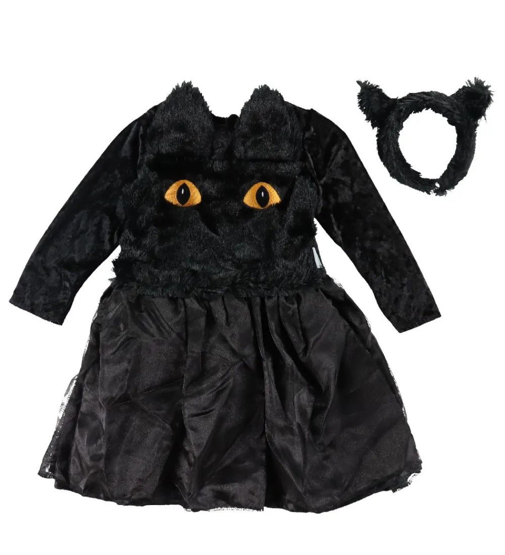 Fin Den Goda Fen udklædning bestående af en sort kjole, som forestiller en kat med broderede øjne og påsyede ører på fronten.