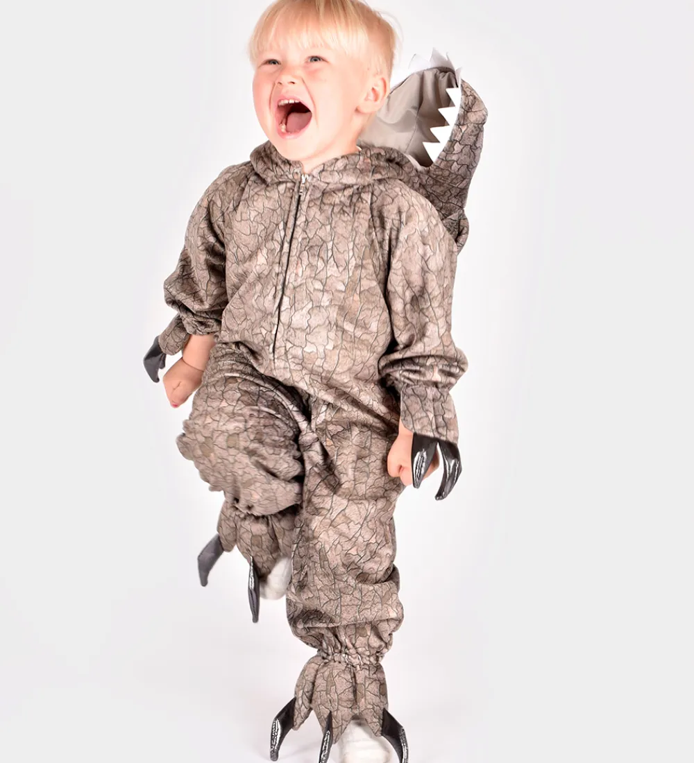 Livagtig Den Goda Fen udklædning, som forestiller en farlig, brun spinosaur med skæl print og skinnende klør samt en lang, polstret hale og rygfinne.