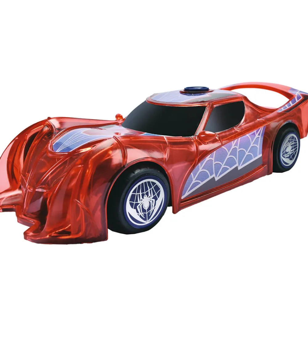Sej Jada bil i rød med blå detaljer og print af en sort edderkop på toppen. Bilen er i modellen “Light Hero Spider-Man”.