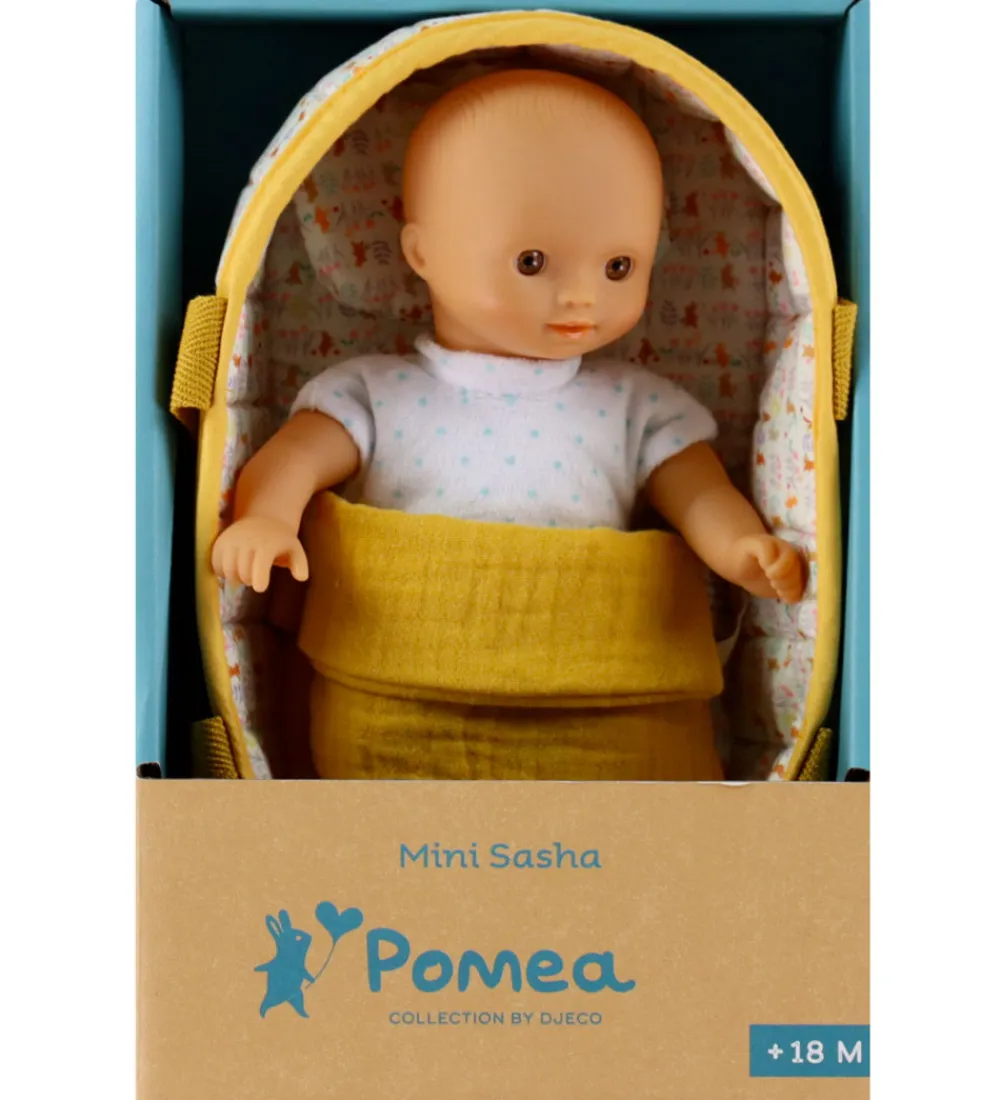 Djeco dukken har en blød krop med en hvid dragt med blå prikker og smukke, nærværende øjne. Dukken har små hænder og fødder med flotte livagtige detaljer.