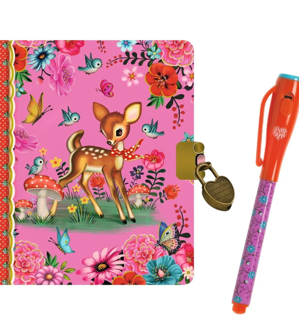Fin Djeco dagbog dekoreret med en bambi og et sødt fugle- og blomsterprint.