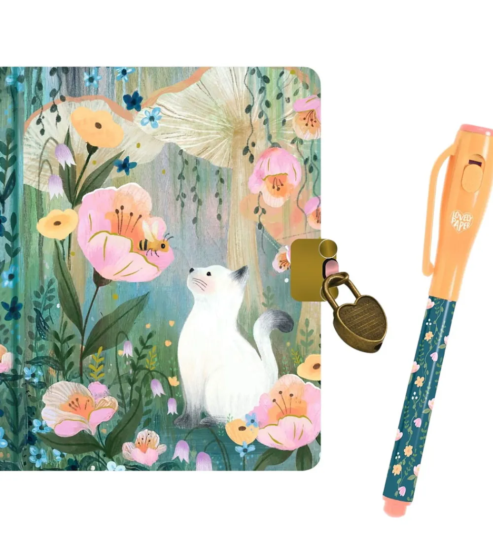 Djeco dagbogen lukkes med en hængelås, så alle dine hemmeligheder kun kan ses af dig. Der medfølger en magisk pen, som kan skrive med usynligt blæk, der kun kan ses, når du lyser på den usynlige blæk med lyset i pennen.