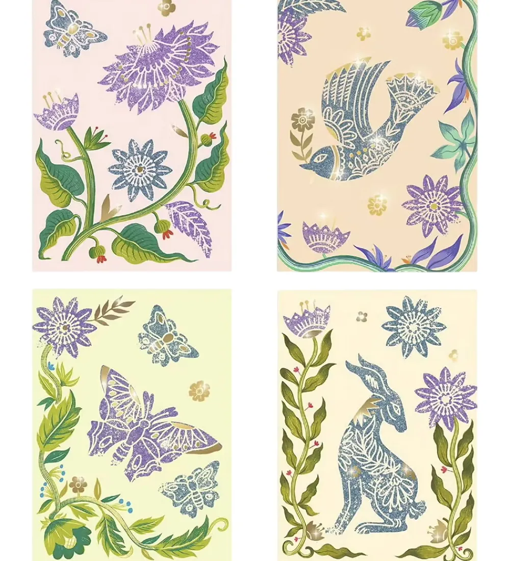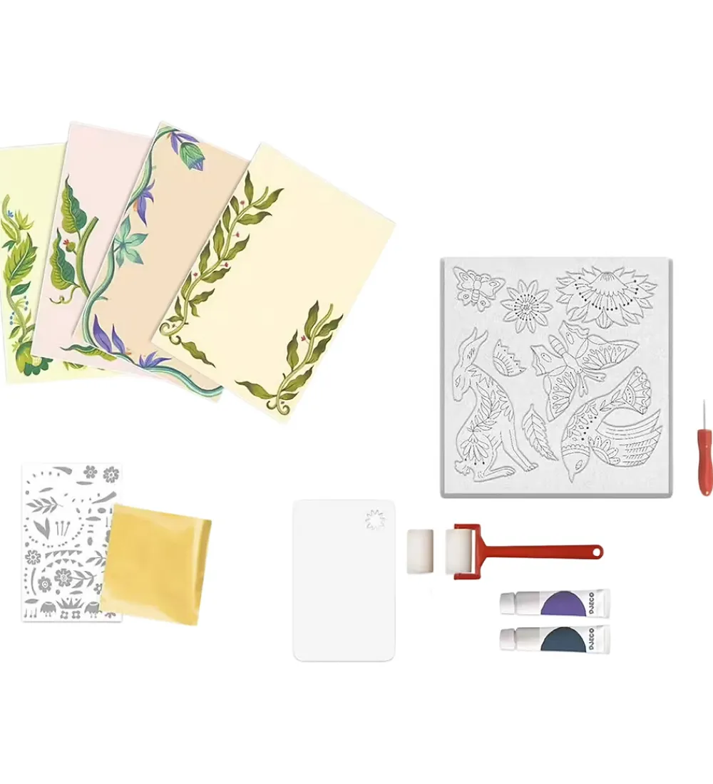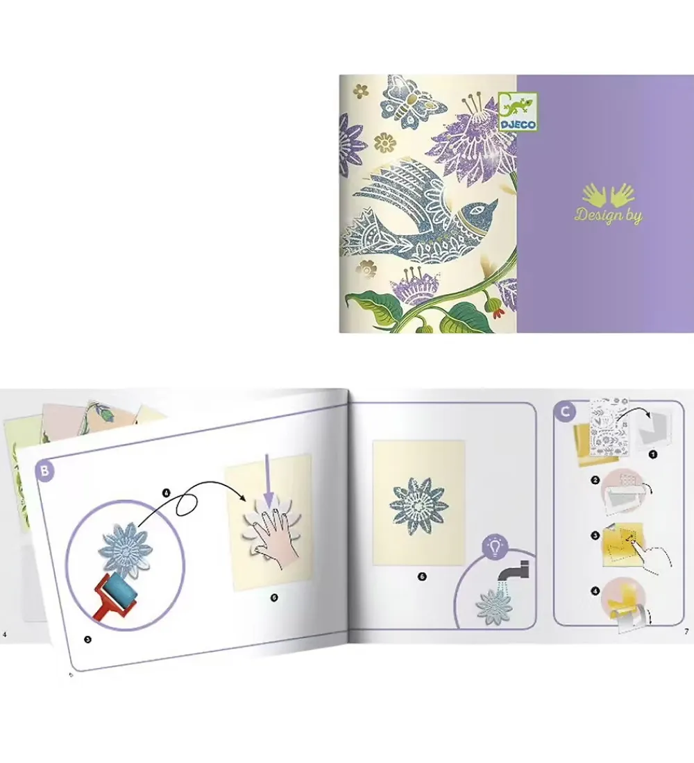 Smukt Djeco kreasæt med blomster- og dyremotiver. Djeco kreasættet indeholder fine illustrationer udført som gravering med fine motiver, samt stempler og maling, der inspirerer til kreativ udfoldelse.