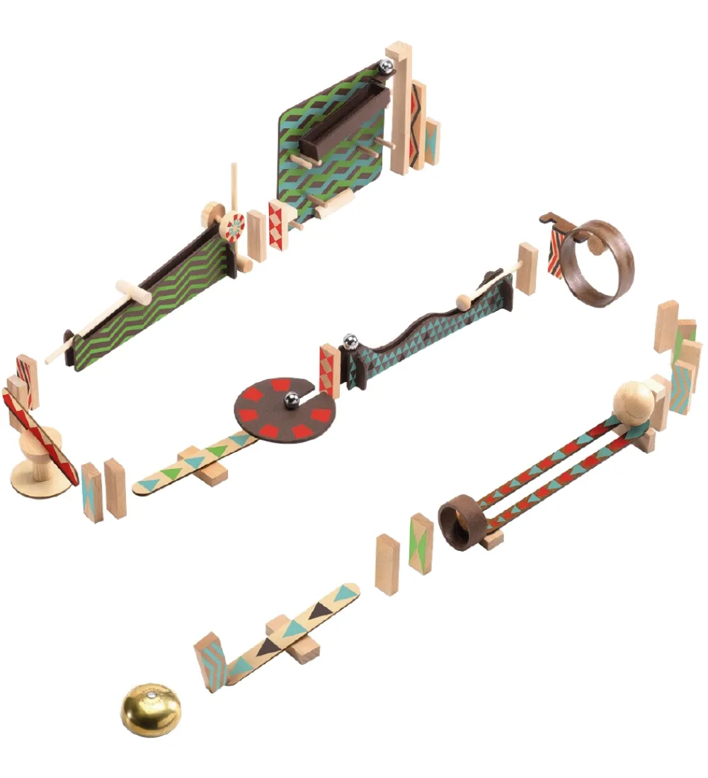 Djeco kuglebanen består af 48 dele, som kan sættes sammen på et utal af måder. Spillet indbyder til mange timers sjov og opfindsomhed med at konstruere en bane og se, hvordan der bliver skabt en kædereaktion.