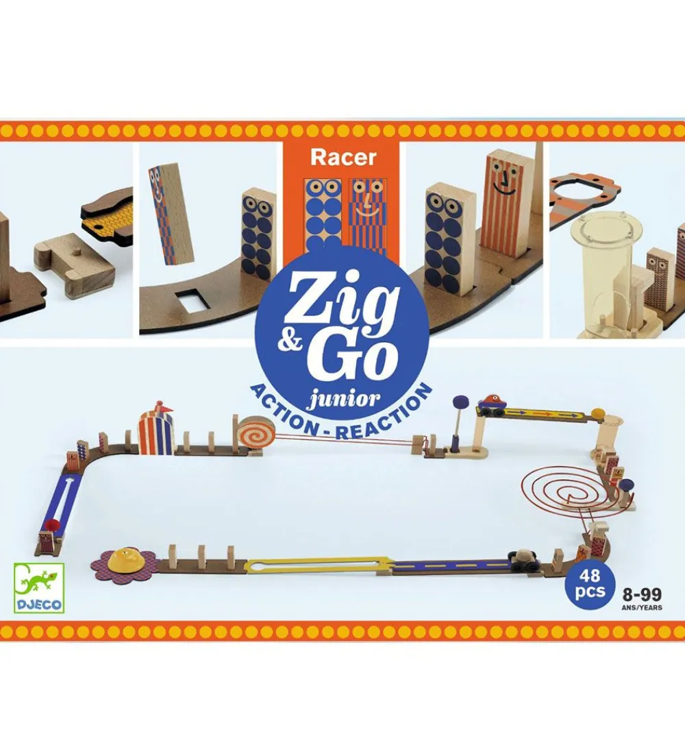 Djeco kuglebanen består af 51 dele, som kan sættes sammen på et utal af måder. Spillet indbyder til mange timers sjov og opfindsomhed med at konstruere en bane og se, hvordan der bliver skabt en kædereaktion.