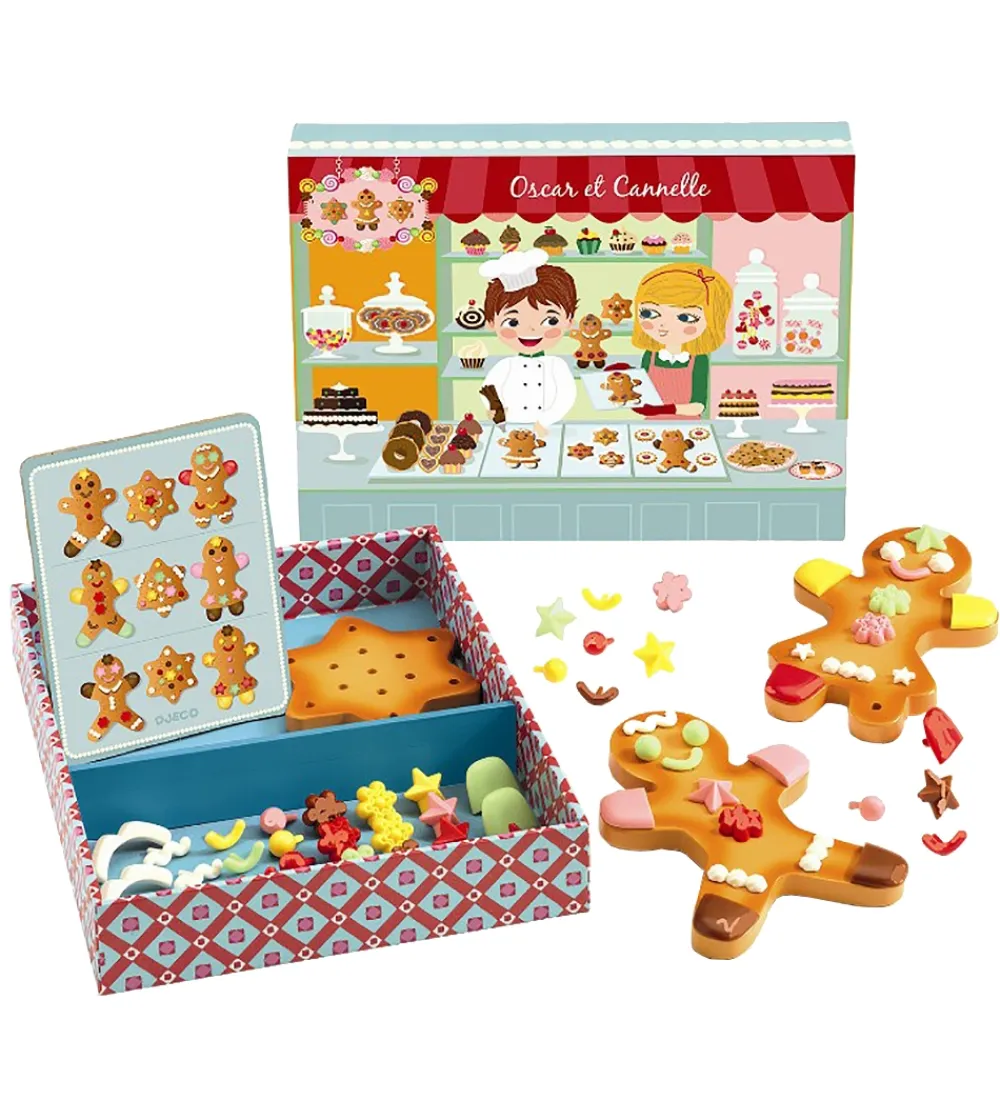 Djeco legemaden består af en æske, som er inddelt i 2 rum, hvor der er plads til forskellige kagemænd og pynten dertil.