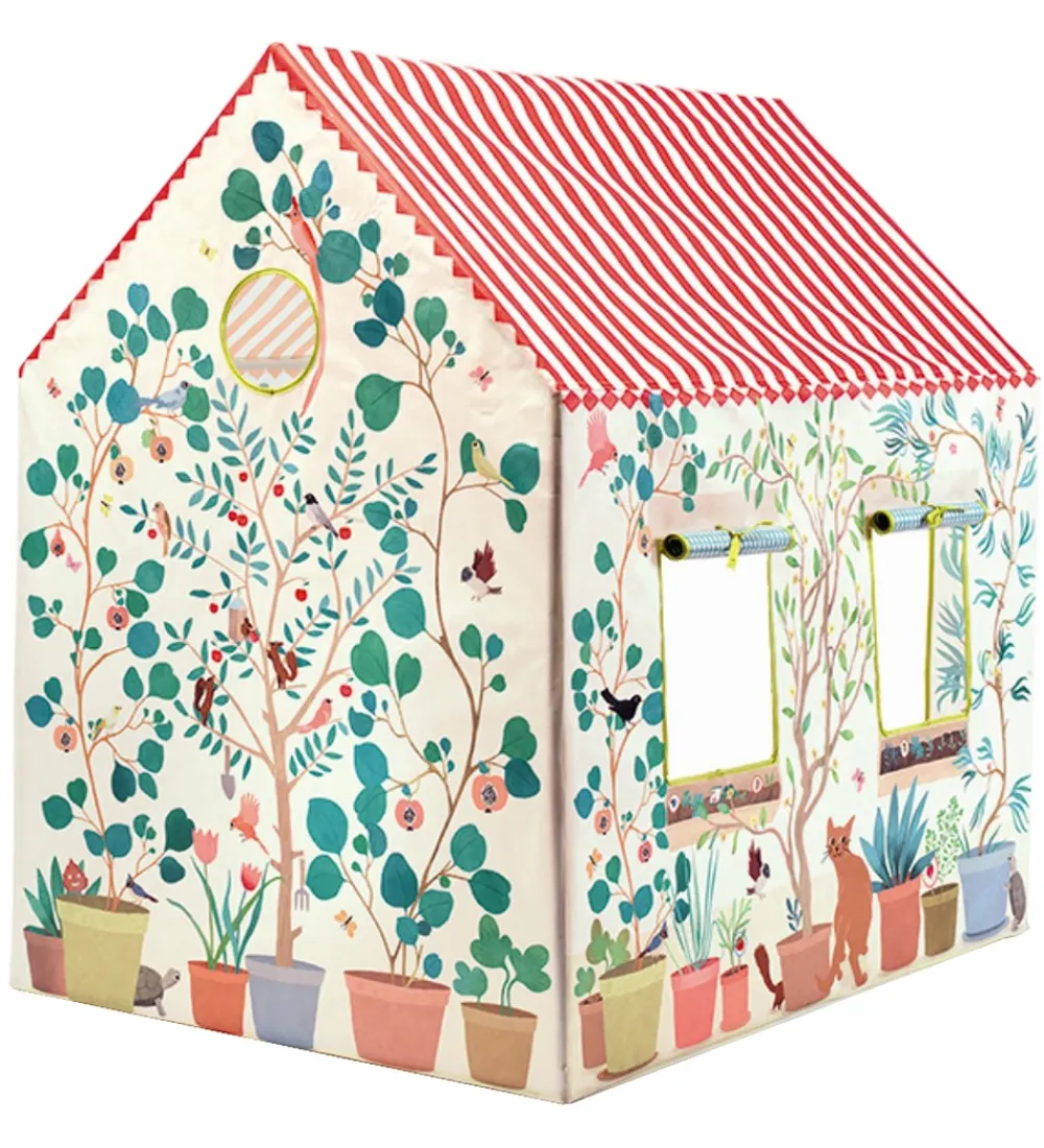 Djeco legeteltet har en firkantet form og ligner et legehus med et stofgulv. Det har en stor døråbning og 4 vinduer, som alle kan holdes åbne med snører.