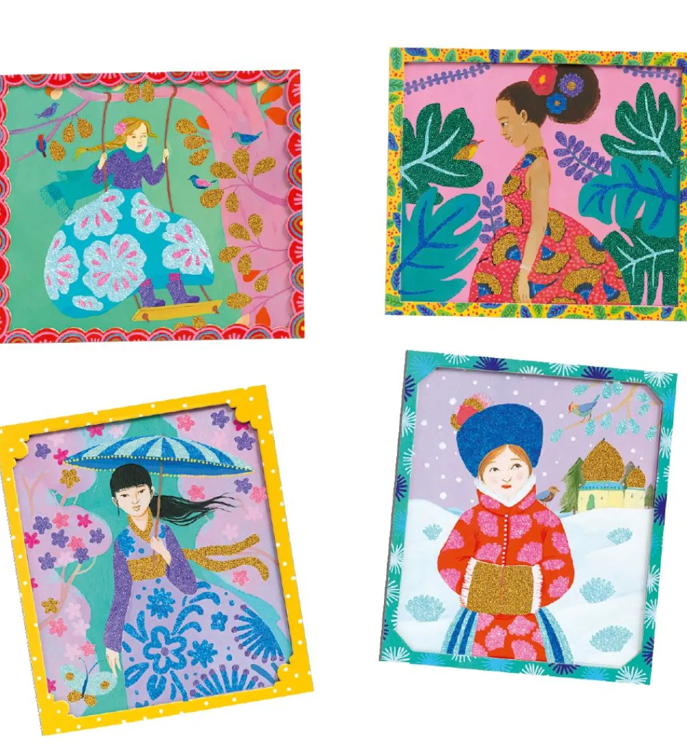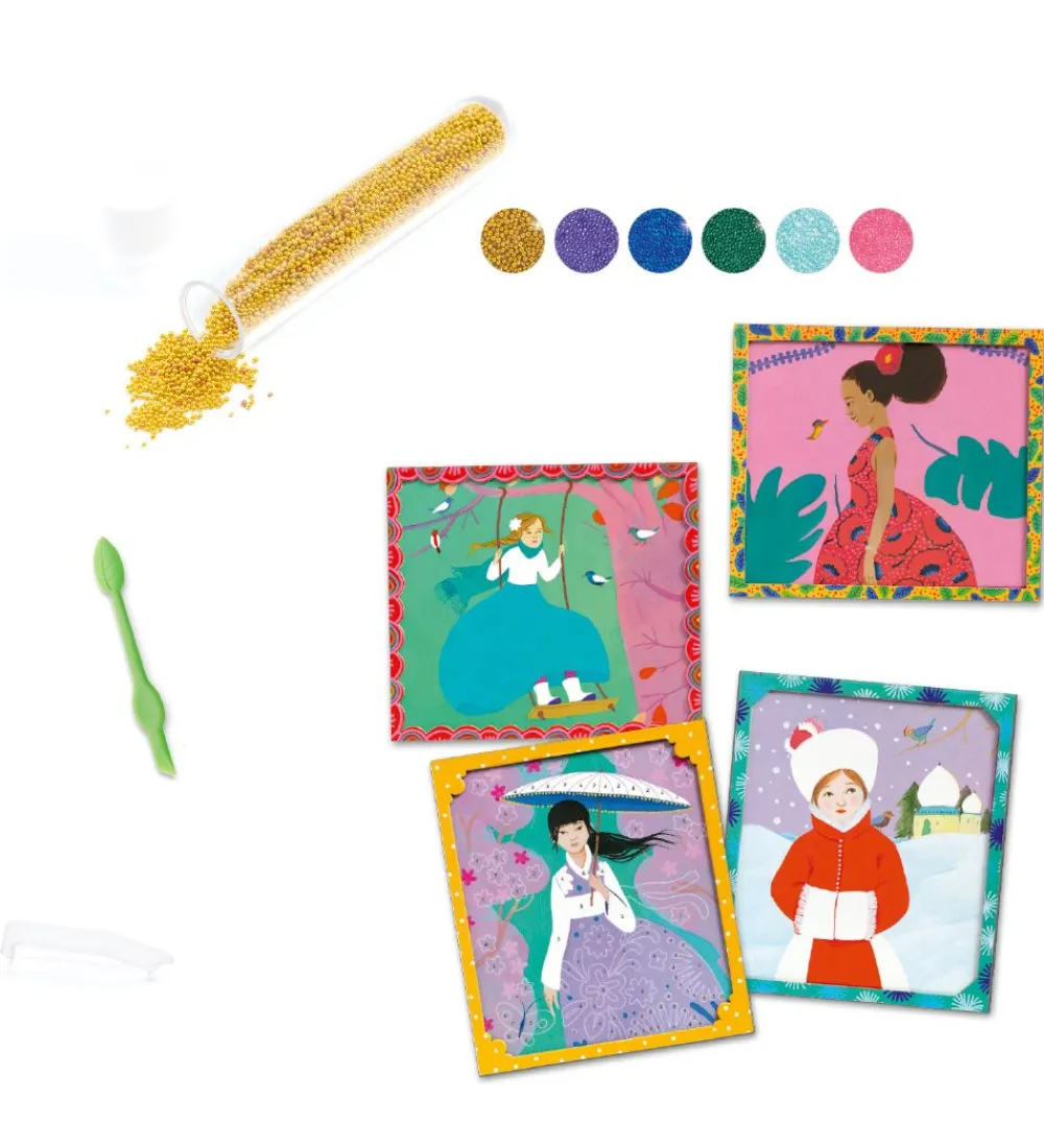 Søde Djeco mikroperler bestående af 6 tuber med forskellig farvede mikroperler, fire billeder med flotte kvinder fra rundt omkring i verden, en grøn spatel, tre beholdere til mikroperlerne og en booklet med inspiration.