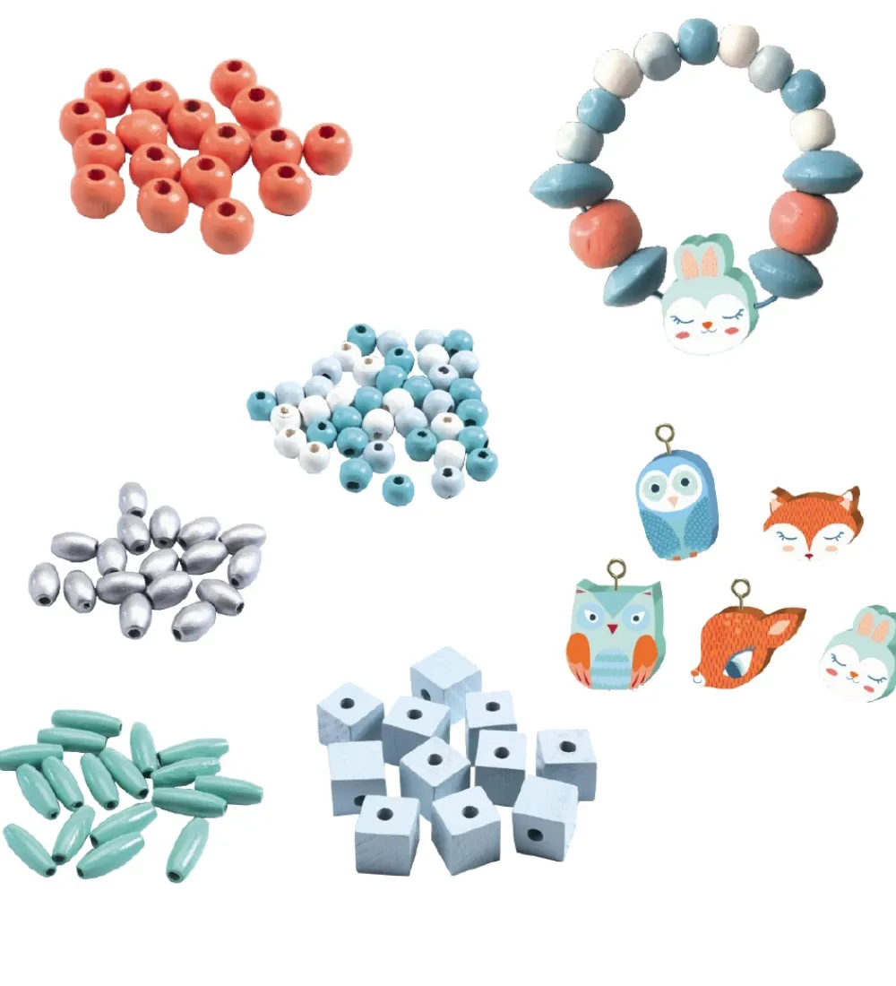 Djeco perlerne har forskellige former som er runde, firkantede og aflange. Æsken indeholder desuden 8 vedhæng, som er formet som søde små dyr fra skoven. Der medfølger 6 meter orange tråd, så det er lige til at gå i gang med at lave fine smykker.