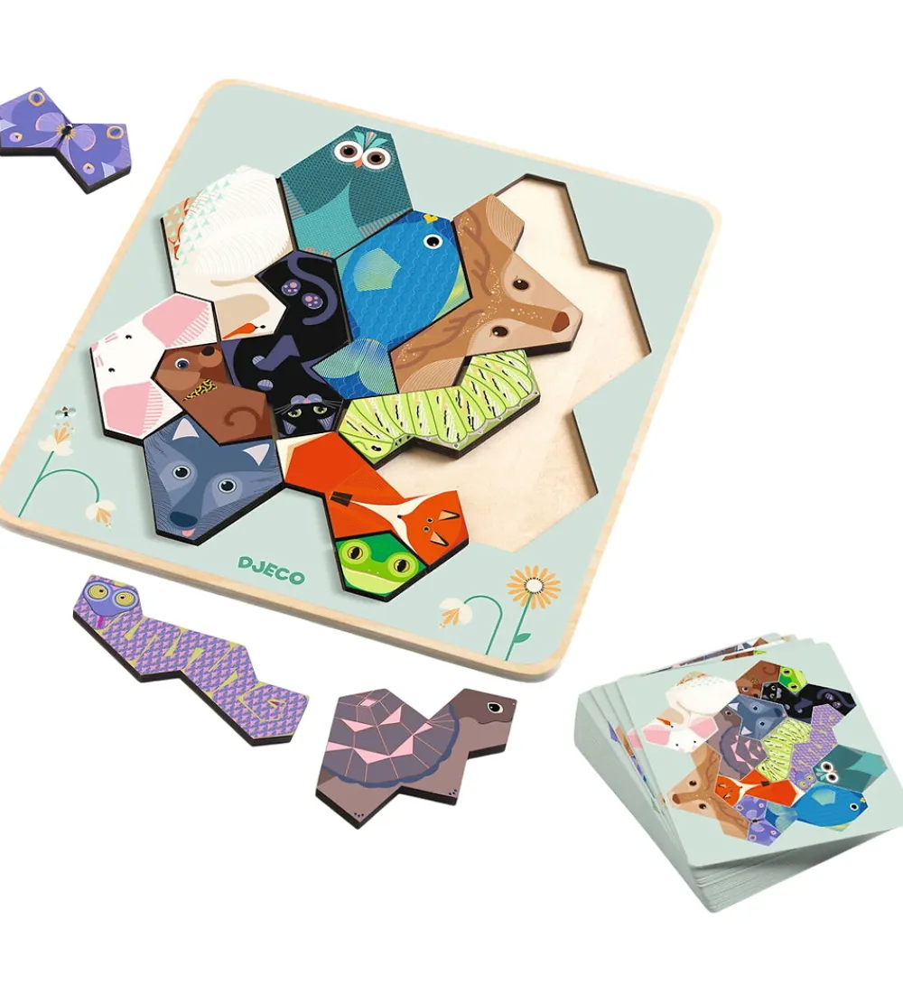 Sjovt Djeco puslespil lavet i træ og med 14 brikker, der hver er et dyr med en kantet form