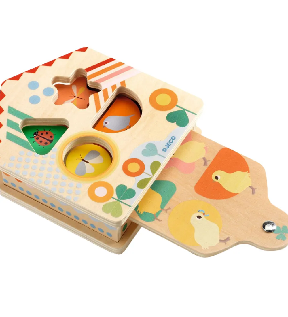 Djeco puttekassen har afrundede hjørner, med fire huller i toppen i forskellige former. Hullerne har hver sin udformning – trekant, cirkel, stjerne og halvcirkel – og der er matchende klodser i flotte farver. I bunden er et håndtag til at trække en plade ud, så brukkerne forsvinder den i hullerne.