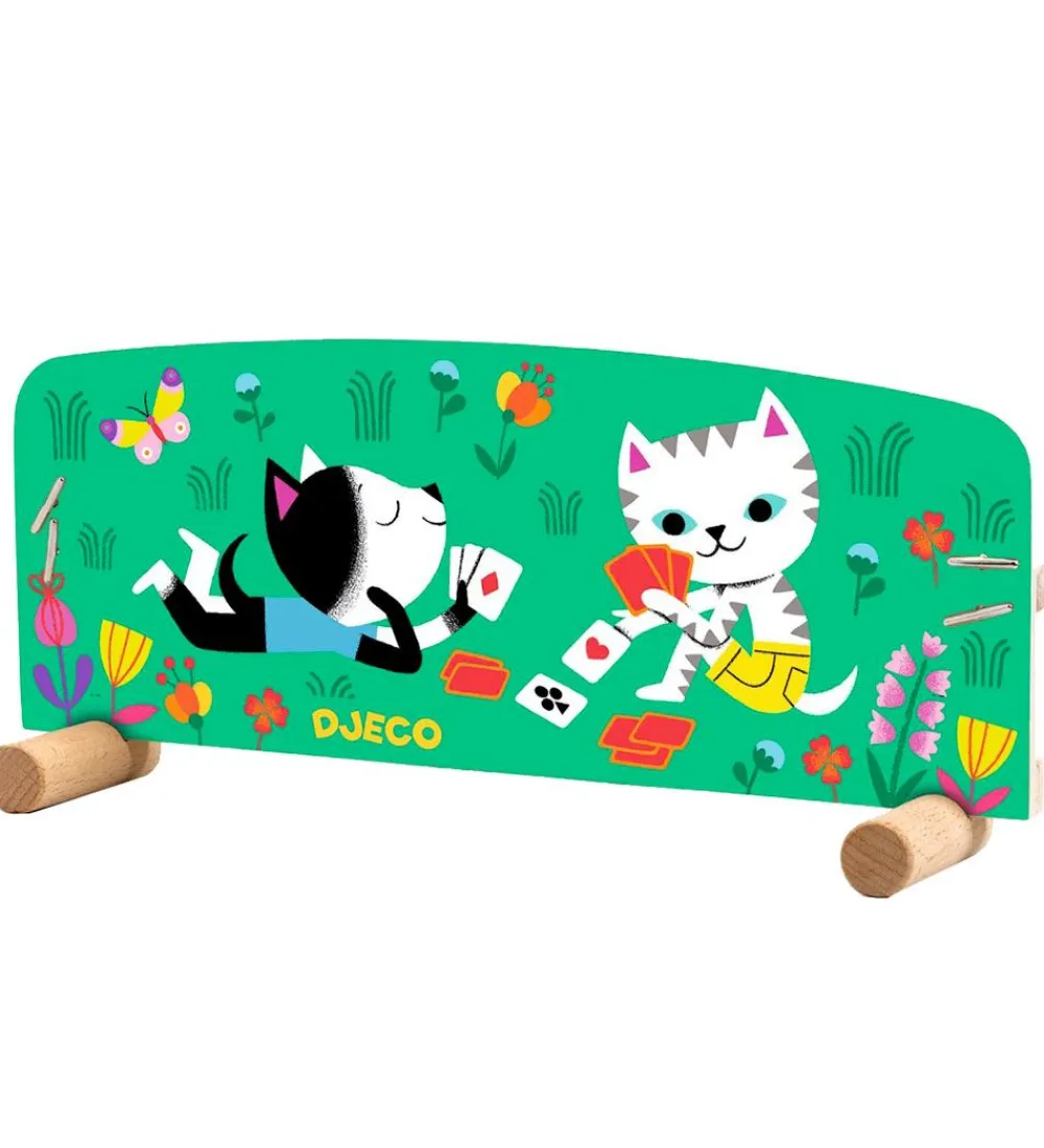 Djeco bordkortholderen er perfekt når de små, skal være med til kortspil. Bordkortholderen har to ben, så den kan stå stabilt på bordet. På den ene side er der en lang ping med elastikker i hver ende, så den kan holde på kortene. Denne gør det nemmere for børnene at overskue deres kort.