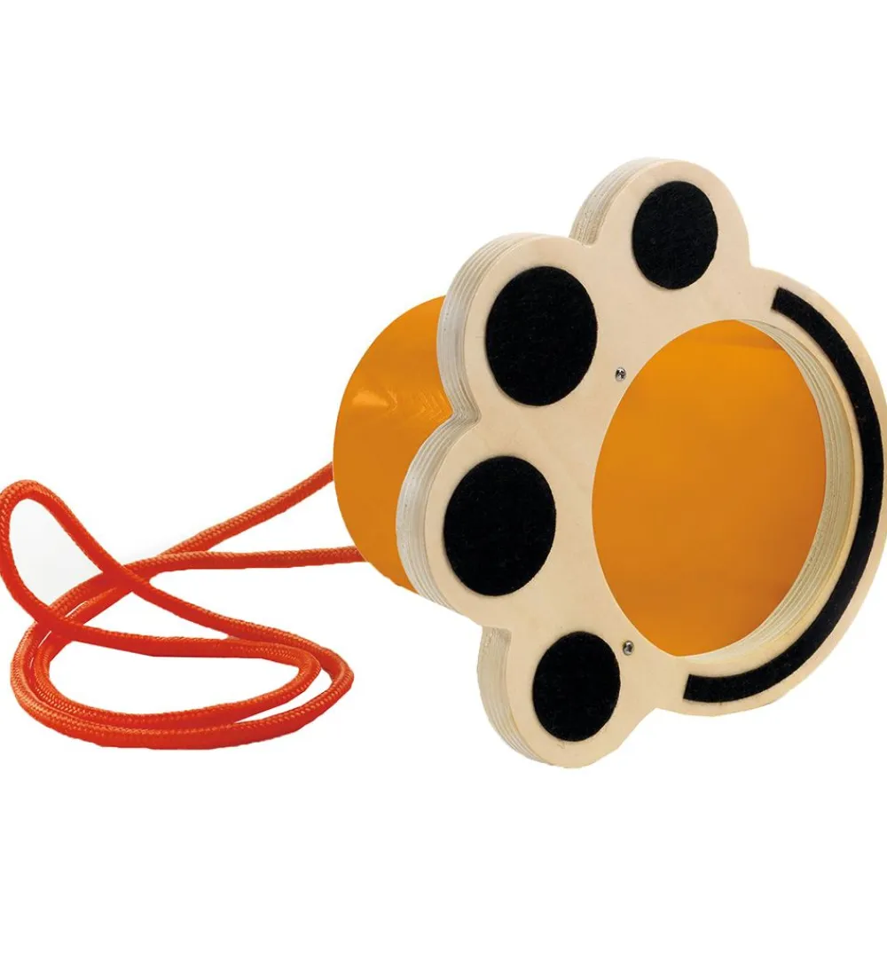 Sjove Djeco løbespande i i gul med et fint mønster samt træ under, som forestiller en dyrs kløer.