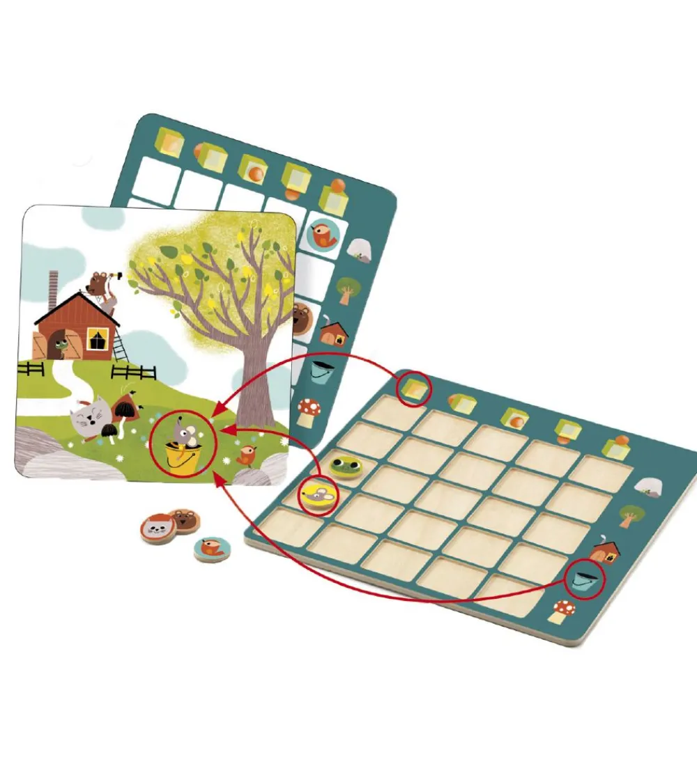 Ud fra et af de 20 illustrationskort skal brikkerne med dyr placeres på spillepladen det samme sted, som dyret er på illustrationskortet.