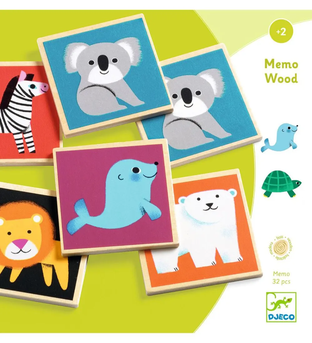 Djeco huskespillet består af 32 kvadratiske træbrikker, der sætter børnens hukkomlese på prøve. Brikkerne blandes og spredes ud med motivet nedad, og herefter går jagten efter ens par i gang. Brikkerne kommer i en praktisk æske, så det let kan pakkes sammen og transporteres.