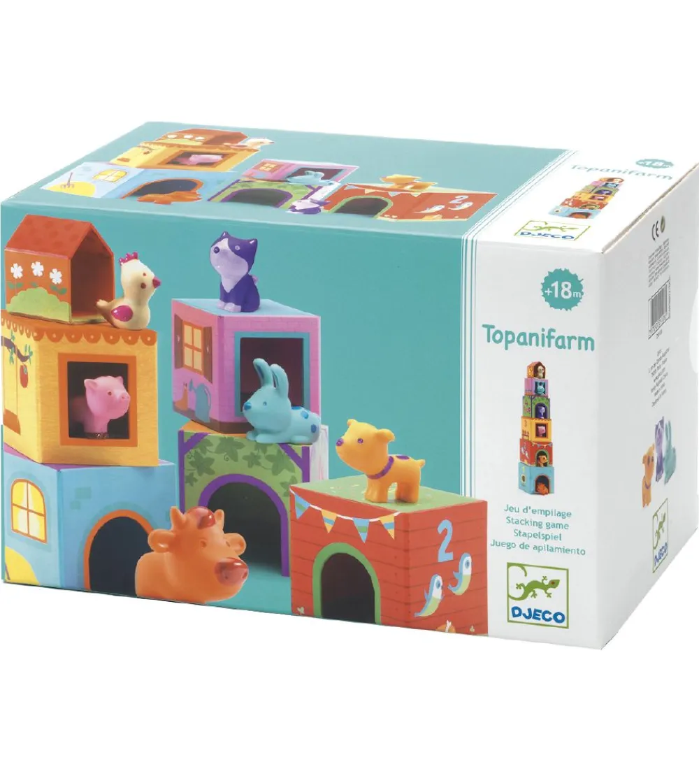 Søde Djeco stableklodser og små dyrefigurer, som er i et hyggeligt bondegårdstema. Der er en ko, en hund, en gris, en kat, en kanin og en høne, som har hvert sit lille hus i form af de farverige stableklodser.