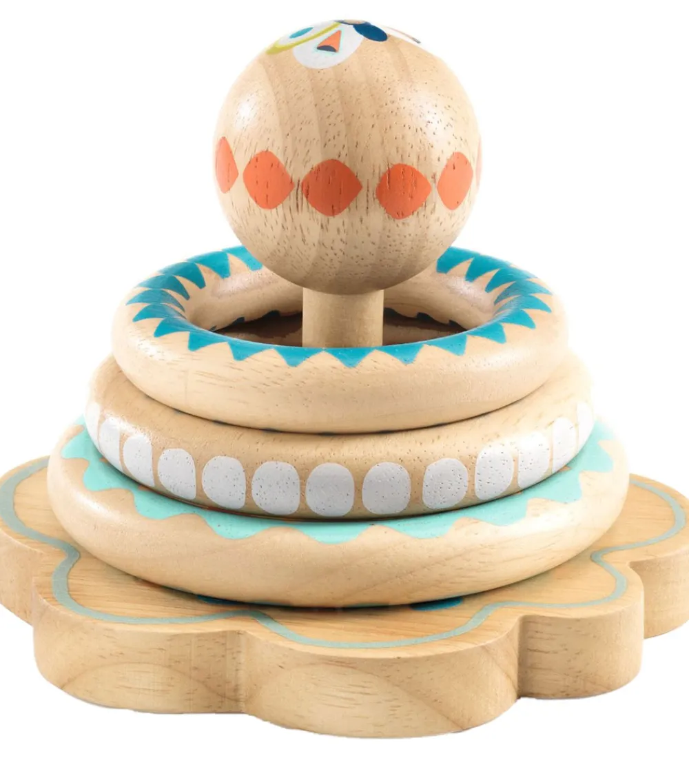 Djeco stablelegetøjet består af en rundt base med en pind der har en bold på toppen. På pinden kan man stable de runde cirkler.