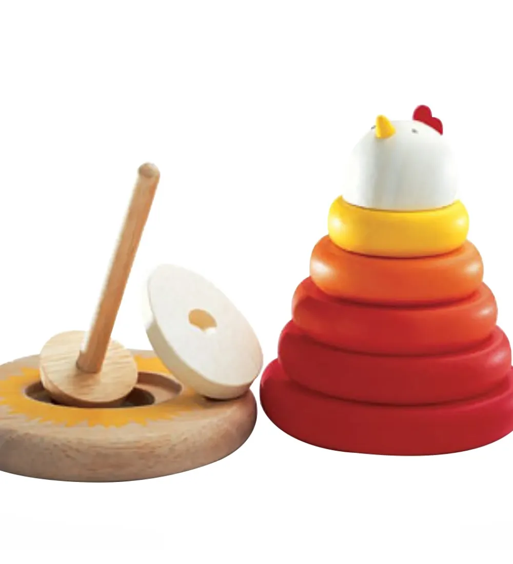 Djeco stablelegetøjet består af en rundt base, som man kan sætte en pind ned i, og på pinden kan man sætte 5 ringe i forskellige størrelser. I bunden skal der være et lille æg, og i toppen kan barnet sætte hønens hoved på.