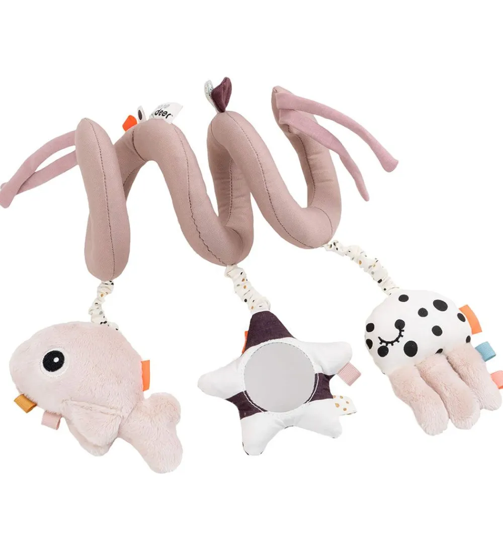 Done by Deer aktivitetslegetøjet består af en blød spiral, hvor der hænger tre stykker legetøj:
