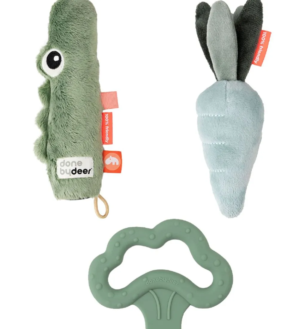 Lækker Done by Deer aktivitetslegetøj bestående af tre dele. Aktivitetslegetøjet indeholder følgende: