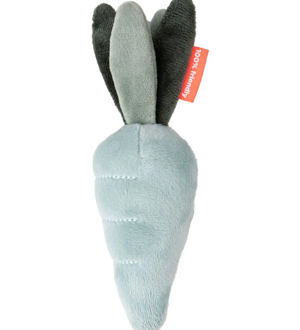- En rangle formet som en grøn gulerod med små kugler indeni, som rasler, når barnet ryster den. På toppen er der fire flapper, som laver knitrende lyder, når barnet rører ved dem.