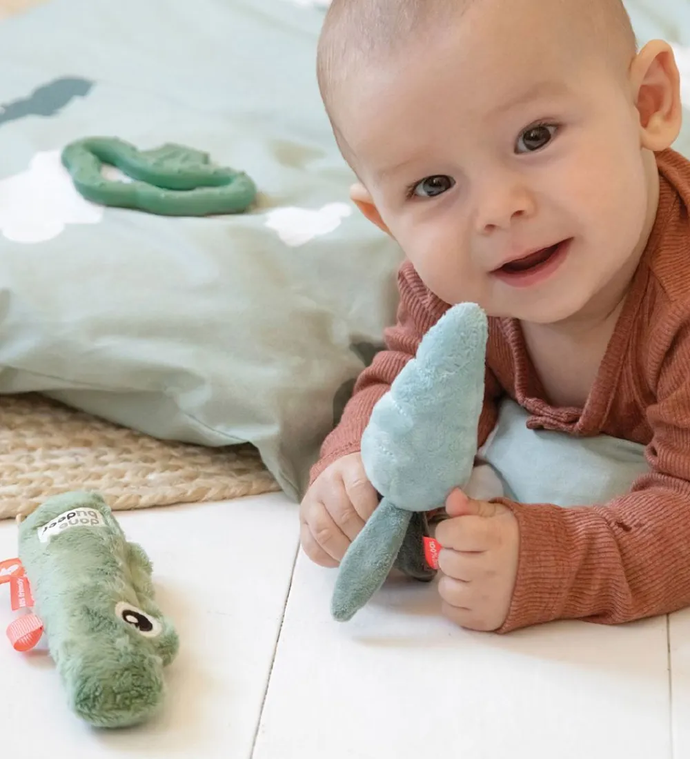 - En rangle formet som en grøn krokodille, som laver en pivelyd, når barnet trykker på ranglen. På krokodillens ryg er der bløde, plys pigge.