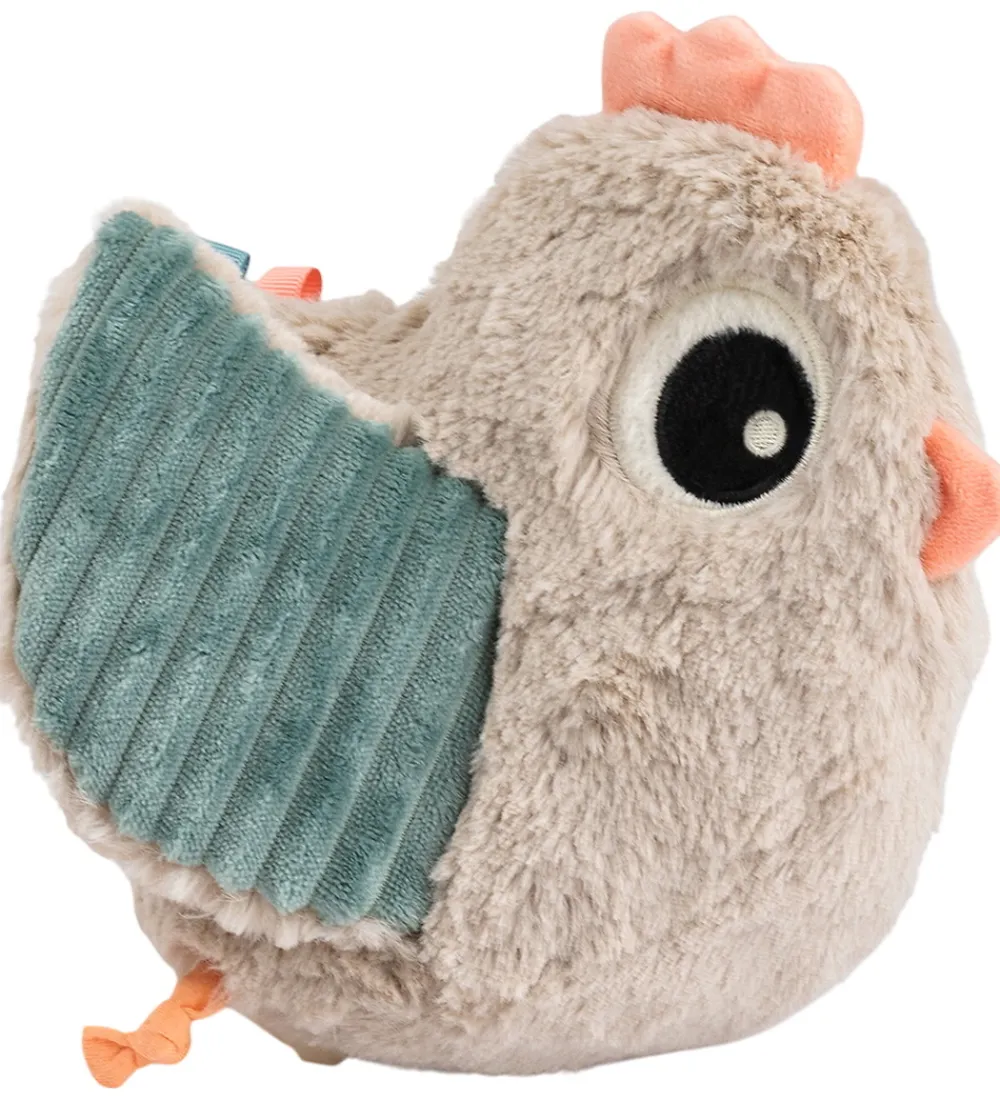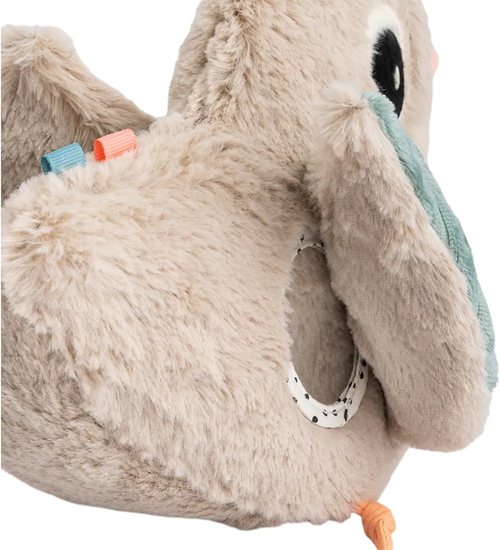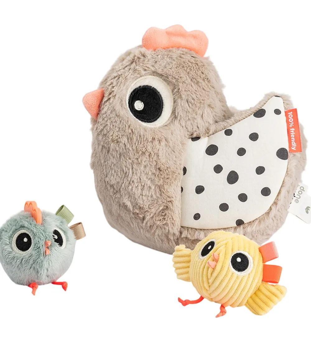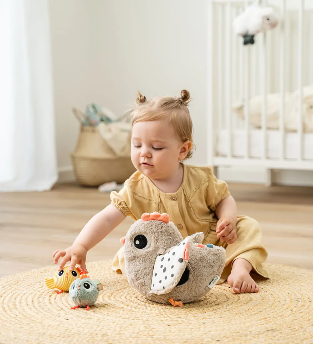 Sødt Done by Deer aktivitetslegetøj bestående af en fugl i beige plys med en prikket vinge og en grøn vinge. Vingerne siger knitrende lyde når man rører ved dem. Bag den ene vinge gemmer sig et spejl, mens der bag den anden vinge gemmer sig en gul og en blå fugleunge med forskellige strukturer. Den gule unge siger en raslelyd når man ryster den.