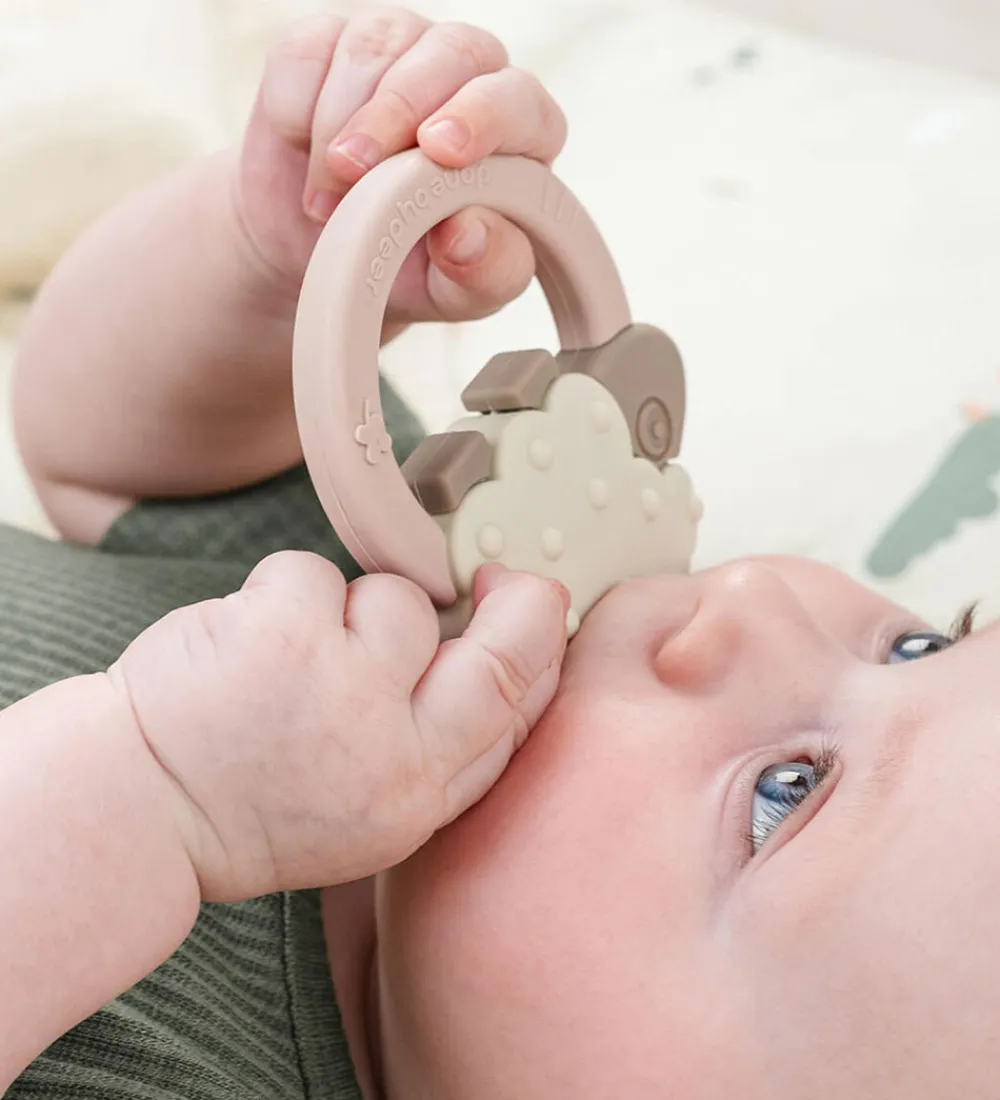Done by Deer bideringen er lavet af silikone, hvor ringen er lavet af hård silikone mens fåret er lavet af blødt silikone. Bideringen har forskellige former og teksturer som er gode for gummer og tænder, mens ringen gør det nemt for barnet at holde fast i.