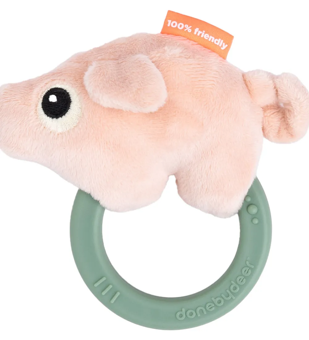 Done by Deer ranglen består af en bidering og lille bamse, som rasler, når barnet ryster med den. Bideringen passer perfekt ind i den lille barnehånd, og er det ideelle stykke legetøj til barnet der øver sig i at gribe.