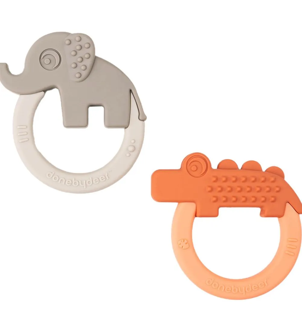 Skønne Done by Deer bideringe solgt i en 2-pak i grå og orange, en med en elefant og en med en krokodille.