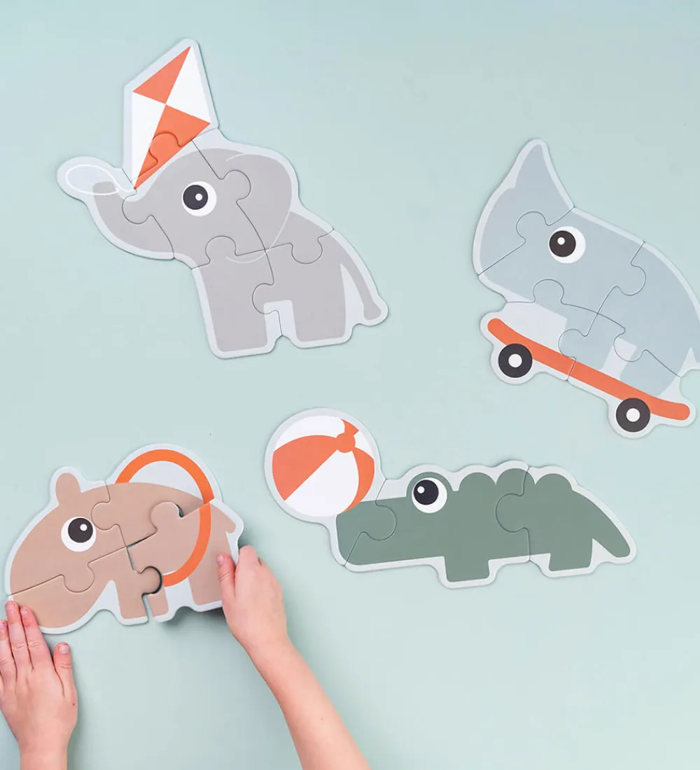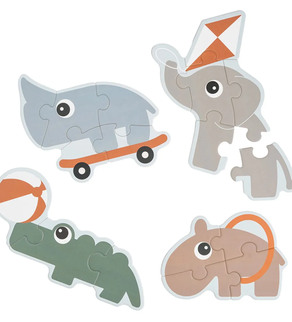 Puslespillet består af 4 puslespil med 3-6 brikker hver, som danner dyrevennerne. Puslespillet træner barnets finmotorik når brikkerne skal sættes sammen. Derudover bliver barnets færdigheder inden for problemløsning styrket og de sjove farver giver en visuel stimulering.