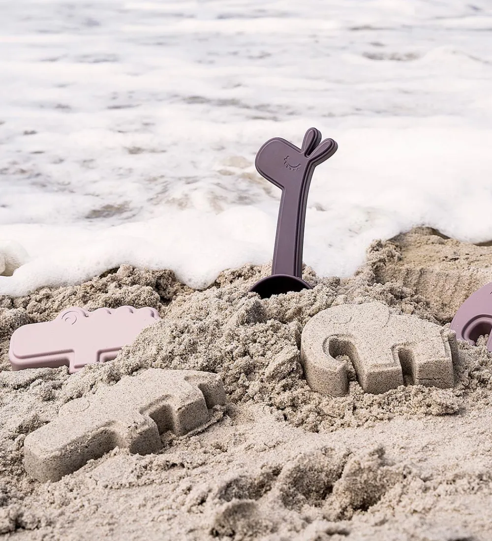 - En mørkelilla skovl, med giraffen Raffi på håndtaget.