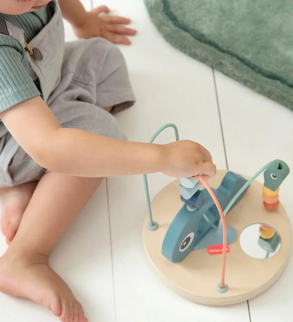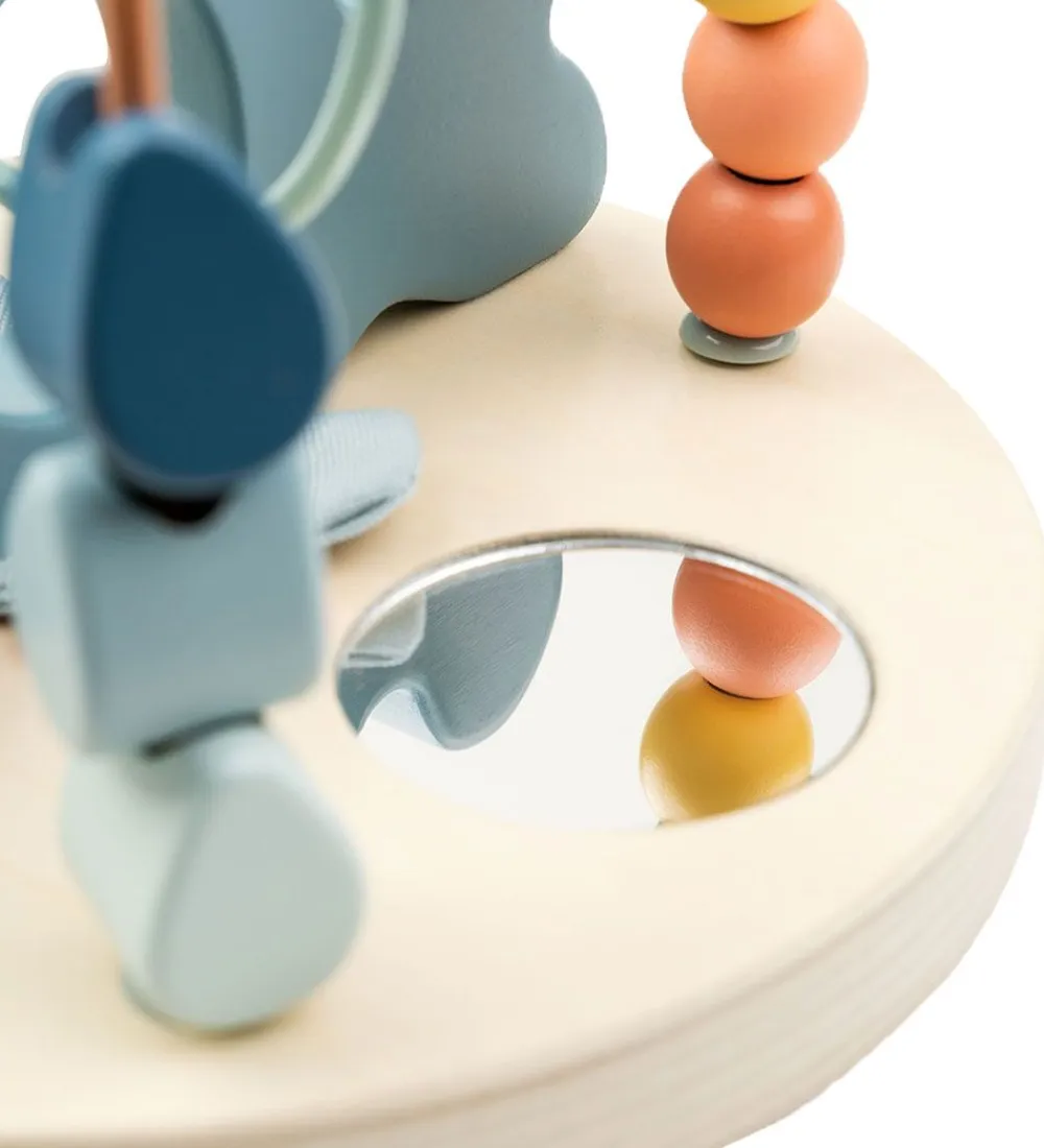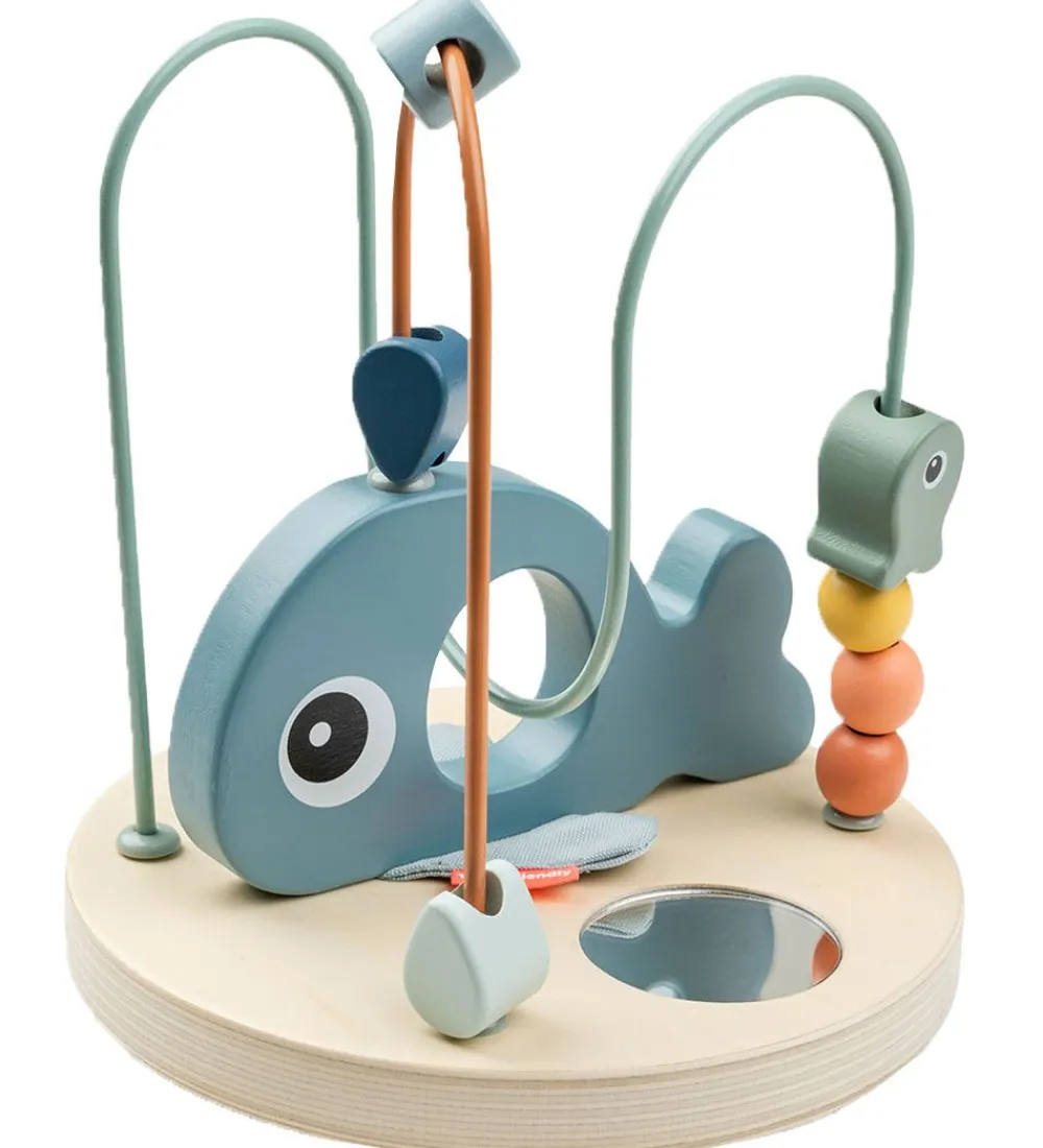 På selve træpladen forneden er der en stor hval samt et lille spejl, så barnet kan se sig selv. Aktivitetslegetøjet er med til at udvikle barnets øje til hånd koordination.