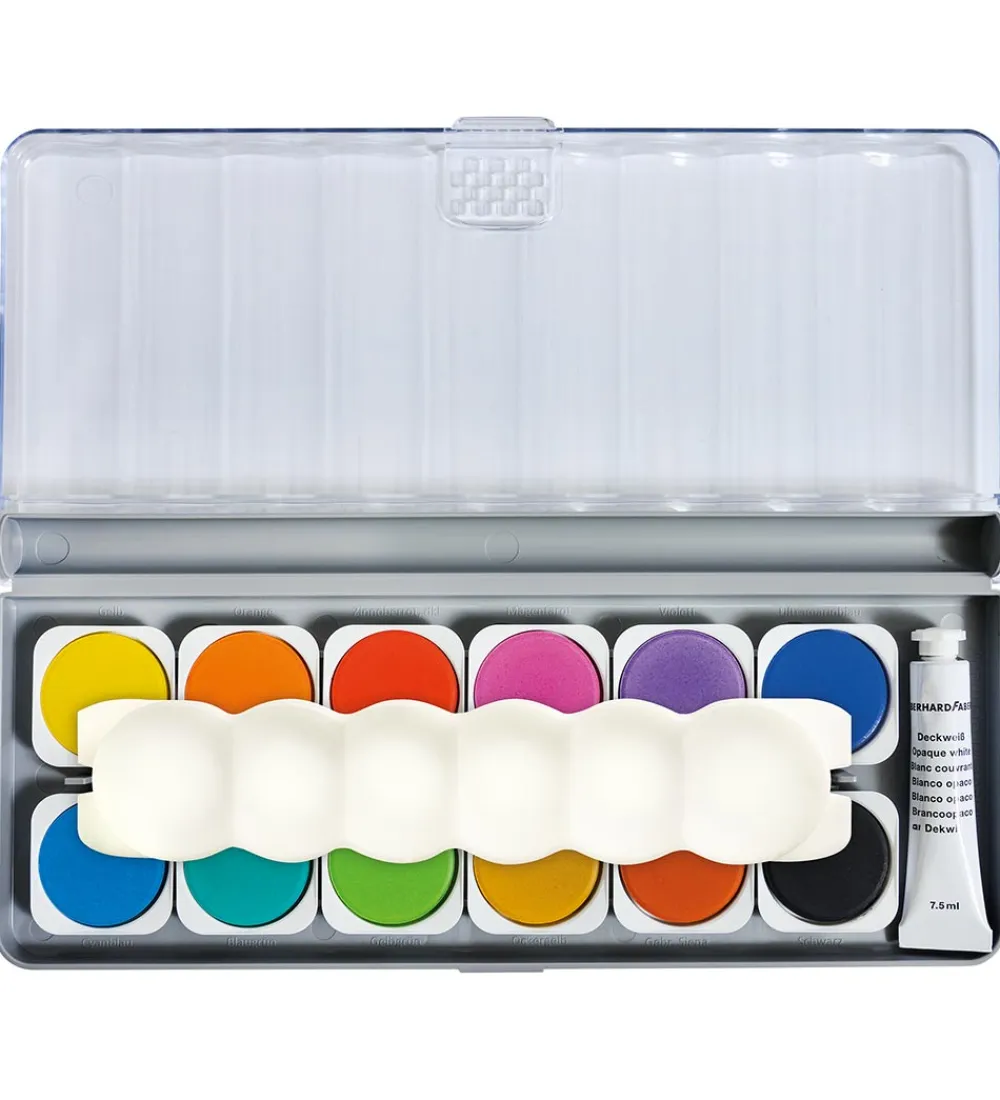 Eberhard Faber vandfarverne kommer i en praktisk plastikbakke, hvor der også er plads til at lægge en pensel. Med de mange farver er det kun fantasien, der sætter grænser. Den store æske gør det let at pakke sammen og transportere.