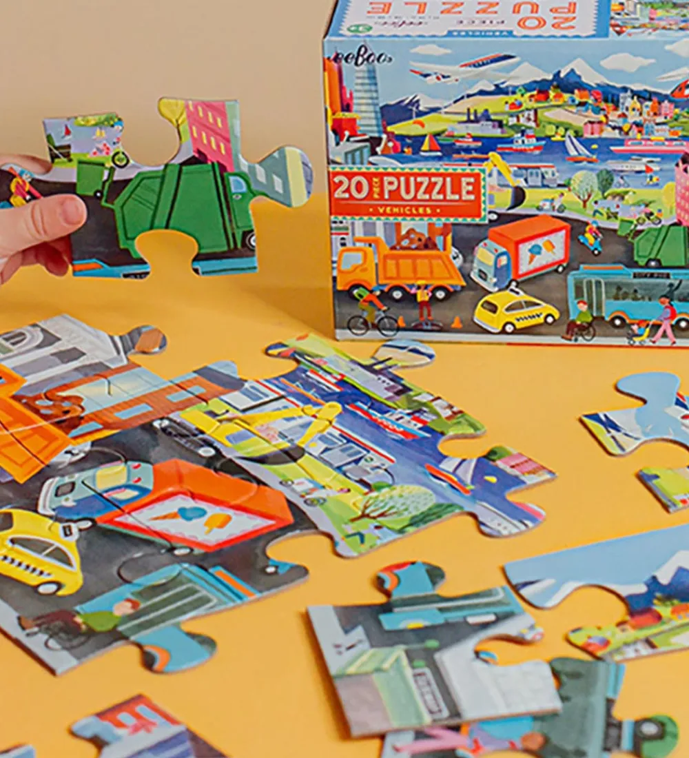 Flot Eeboo puslespil med motiv af en by fyldt af transportmidler.