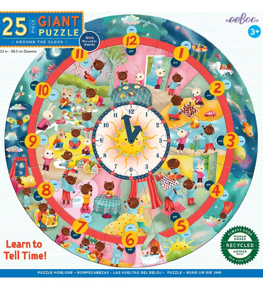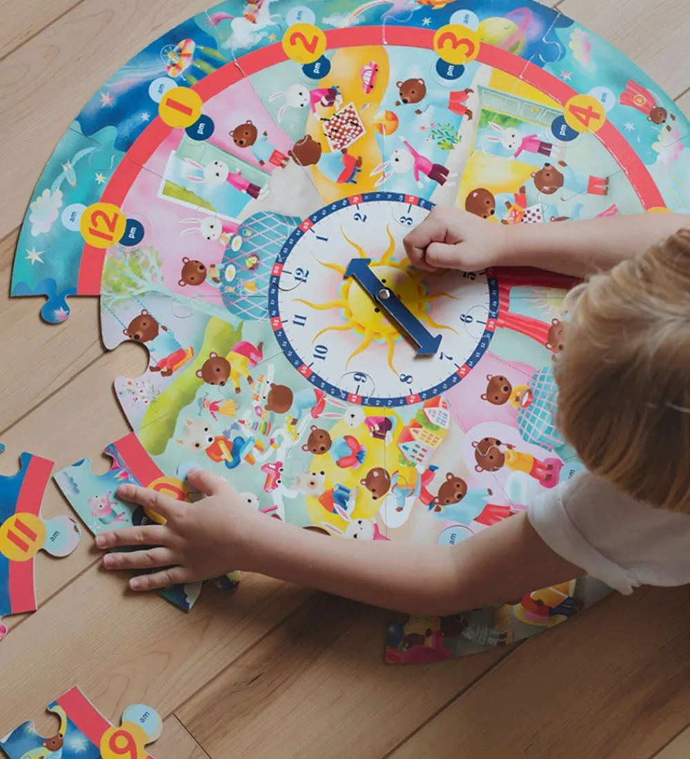 Sjovt Eeboo puslespil, bestående af 25 brikker med døgnets timer.
