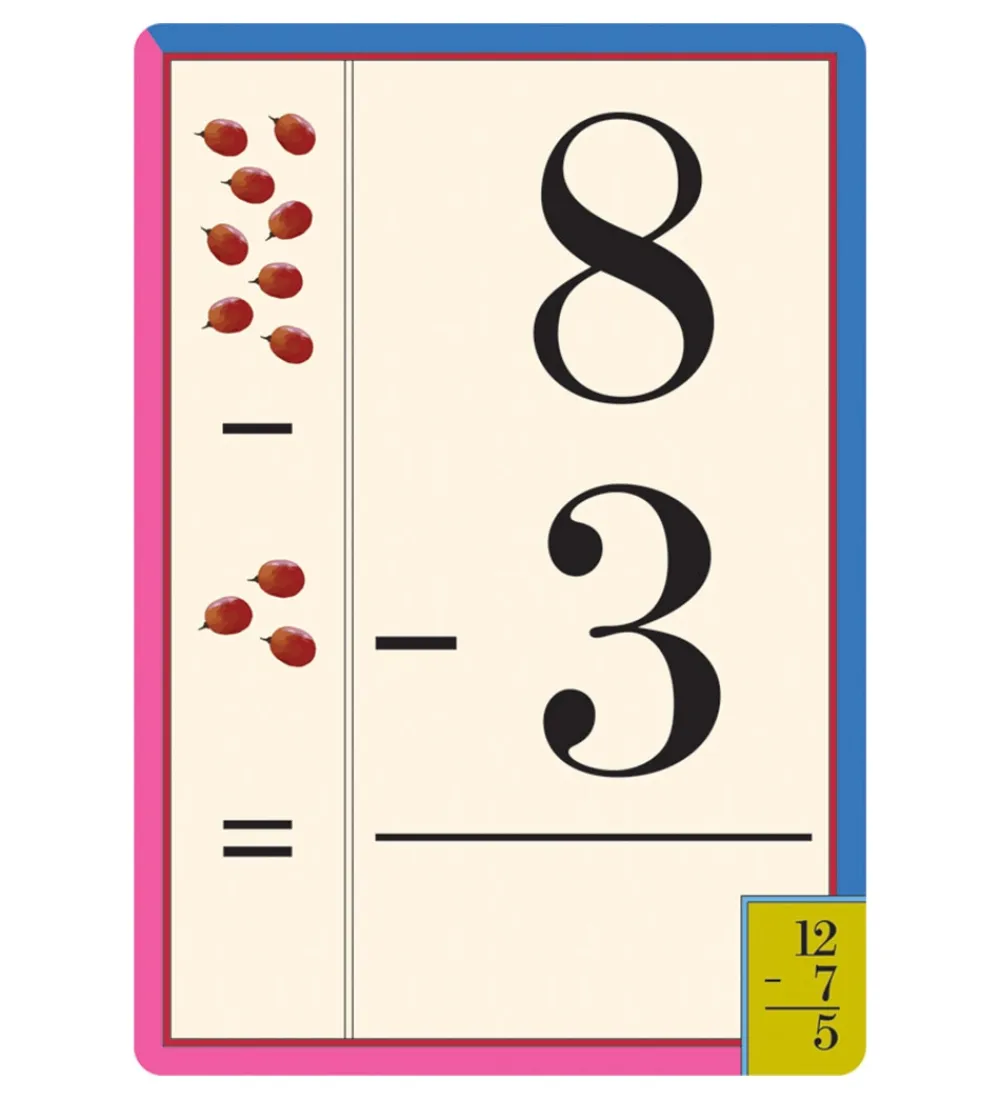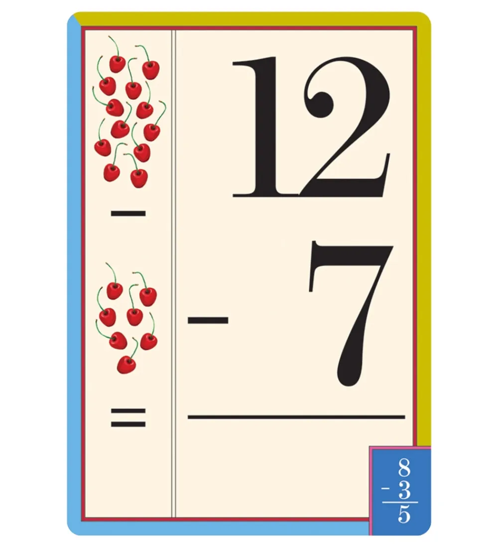 Eeboo læringsspillet lærer barnet at trække to tal fra hinanden ved hjælp af frugter. På hvert kort er der regnestykker på begge sider. Når barnet har lavet regnestykket kan kortet vendes om, hvor man kan tjekke om svaret er korrekt.
