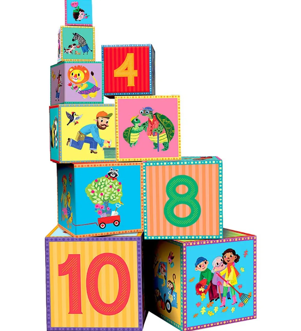 Fine Eeboo stableklodser i flotte farver med tal, dyr og mennesker. Illustrationerne afbilleder gode gerninger.