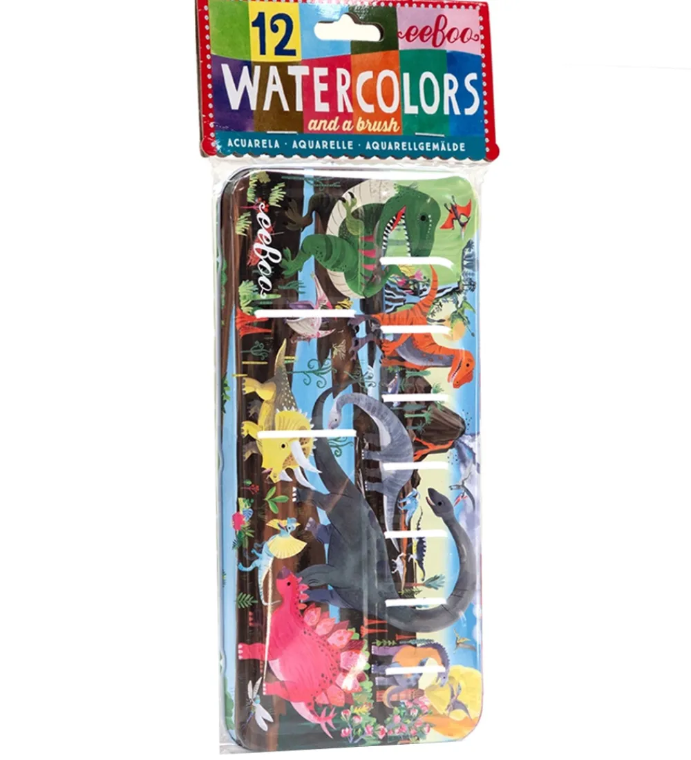 Fine Eeboo vandfarver bestående af en kasse med 12 flotte farver med et dinosaur tema.