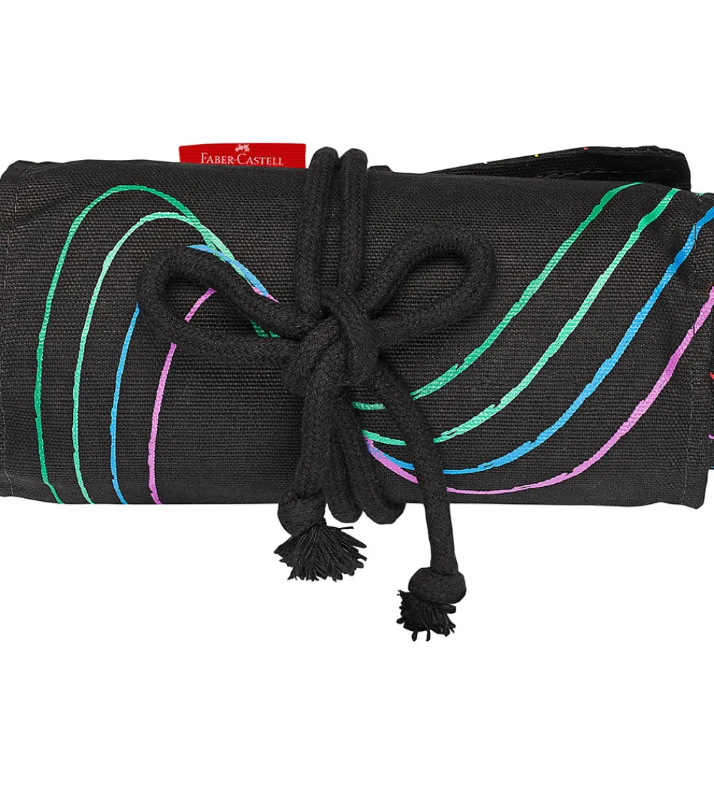 Skønne Faber-Castell sorte farveblyanter i et sæt med 72 stk. i forskellige farver, heriblandt pastel, neon og metallisk. Derudover kommer de med et rullepenalhus.