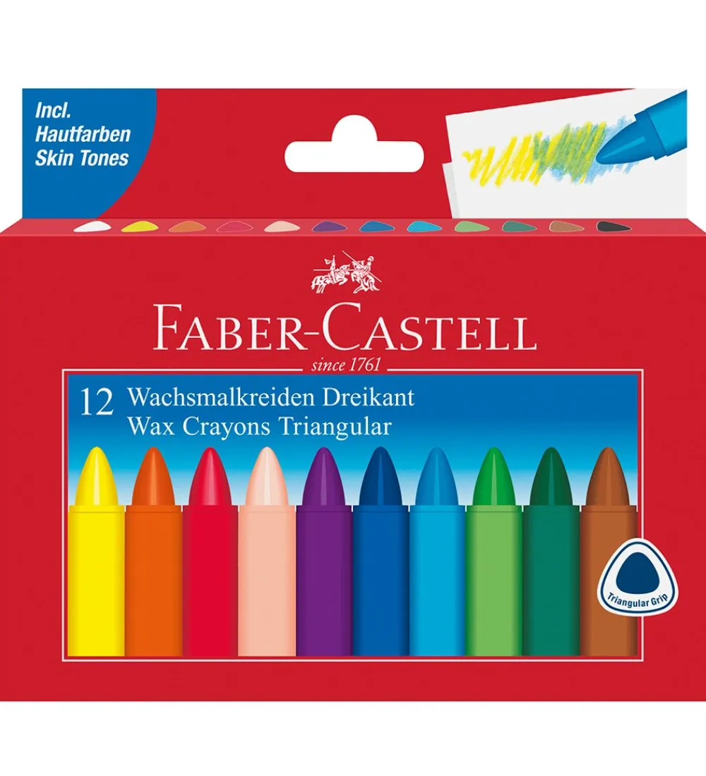 Faber-Castell farvekridtet har en ergonomisk trekantet form, som sikrer et godt greb. Farvekridtet er vandfast og har et dekorativt papirbånd omkring dem, så fingrene ikke bliver beskidte.