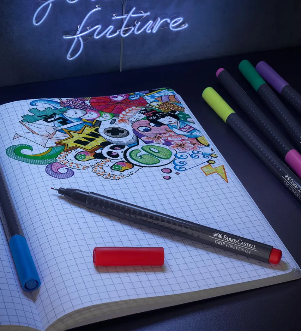 Faber-Castell finelinerene har en ergonomisk, trekantet form med praktiske knopper på stiftet som giver et godt greb. Lågene er ventilerende, så farverne ikke tørrer ud og de har en ekstra smal spids, så man kan få de helt små detaljer med. Farverne er baseret på madfarve.