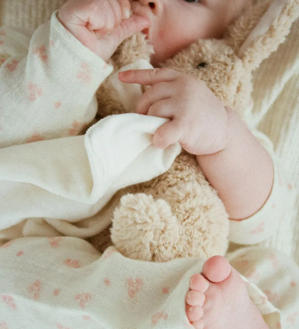 Charmerende Fanga Fontana nusseklud i cremhvidt velour med en nuttet kanin i det ene hjørne. Med nussekluden kommer en bamse som kan holde fast på nussekluden. Den hyggelige nusseklud fra Fanga Fontana er perfekt til små arme at kramme.