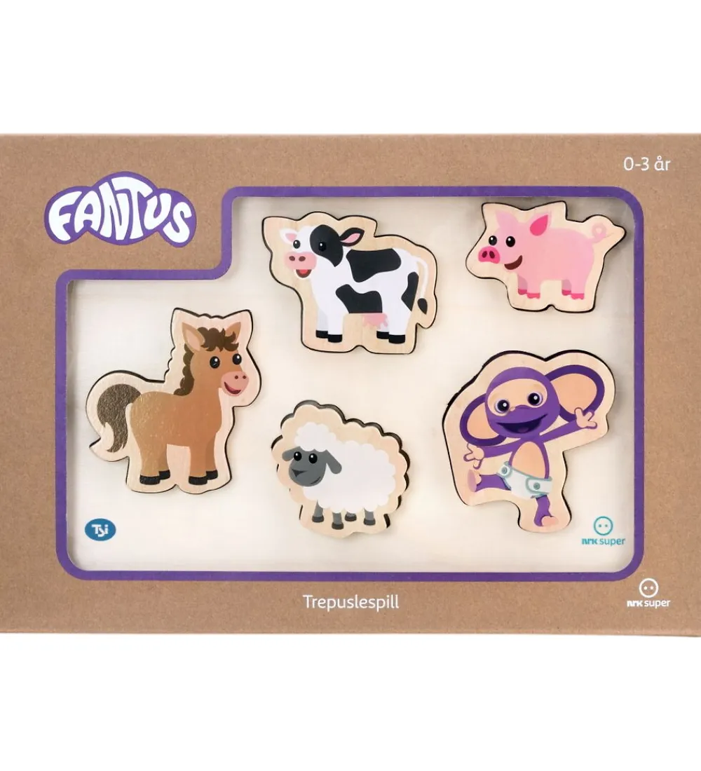 Fine Fantorangen & Fantus puslespil af træ og med 5 brikker i et “bondegårdsdyr”-tema.