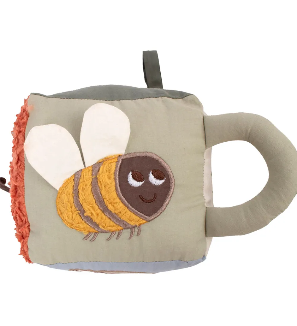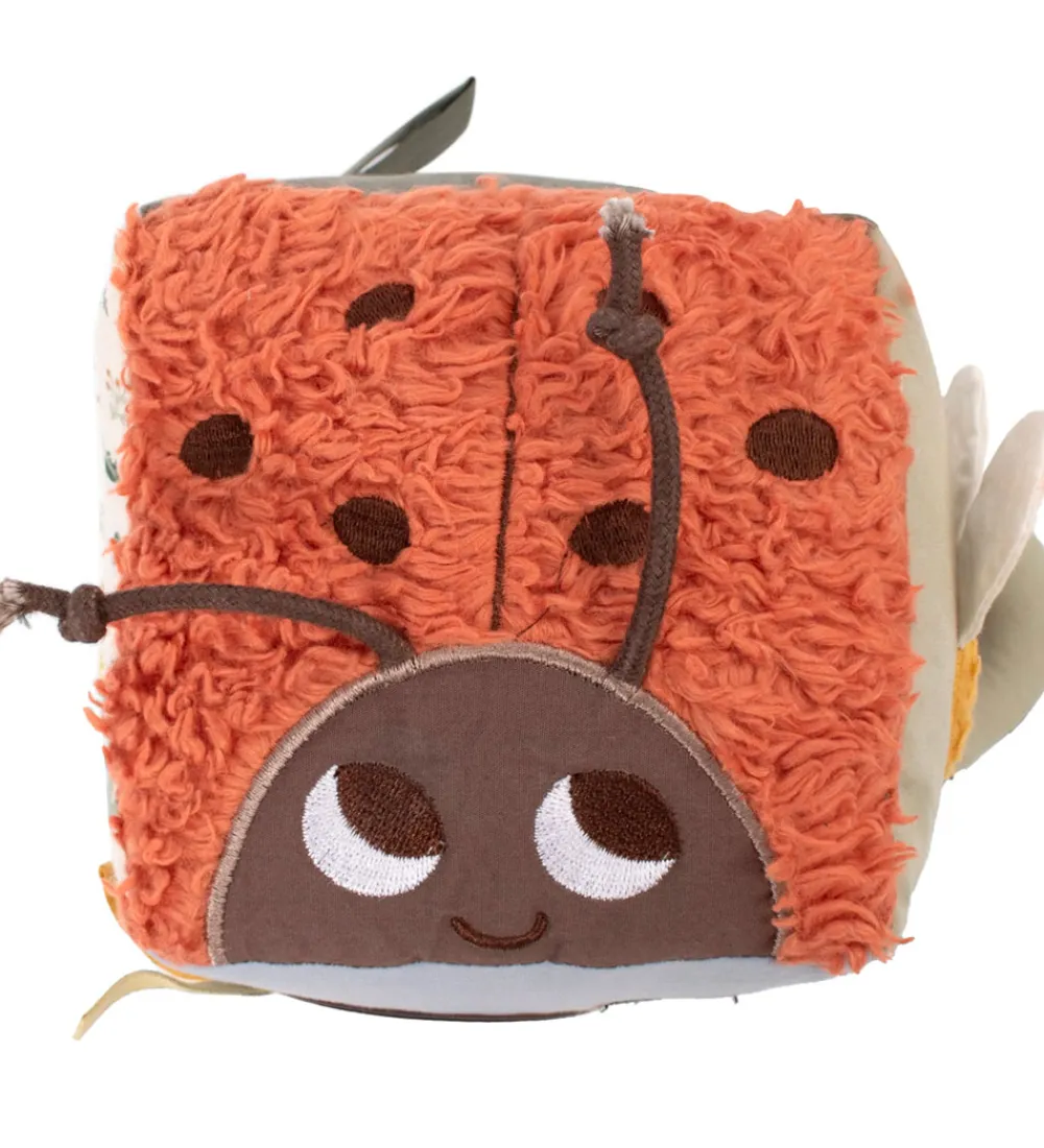 Filibabba aktivitetsterningen er firkantet og fyldt med stimulerende detaljer som f.eks. spejl, klokke, illustrationer, knitrende lyd, snore og stof, så der er masser af ting, som små hænder kan udforske – ikke mindst siden med en mariehøne i bamseplys.