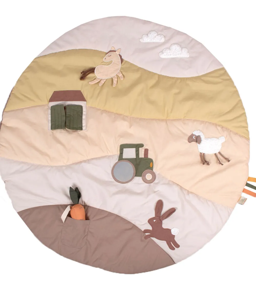 Sødt Filibabba aktivitetstæppe i et farverigt motiv med et bondegårdslandskab.