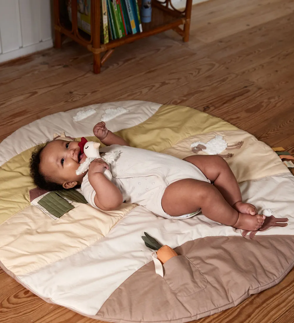 Filibabba aktivitetstæppet har en rund forrm med en let vattering, så barnet vil sidde, lege og ligge behageligt. Aktivitetstæppet vil holde barnet beskæftiget med de små aktiviteter, som tæppet har. Barnet kan lege gemmeleg med kyllingen, grave en gulerod op eller se sig selv i traktorens spejl.